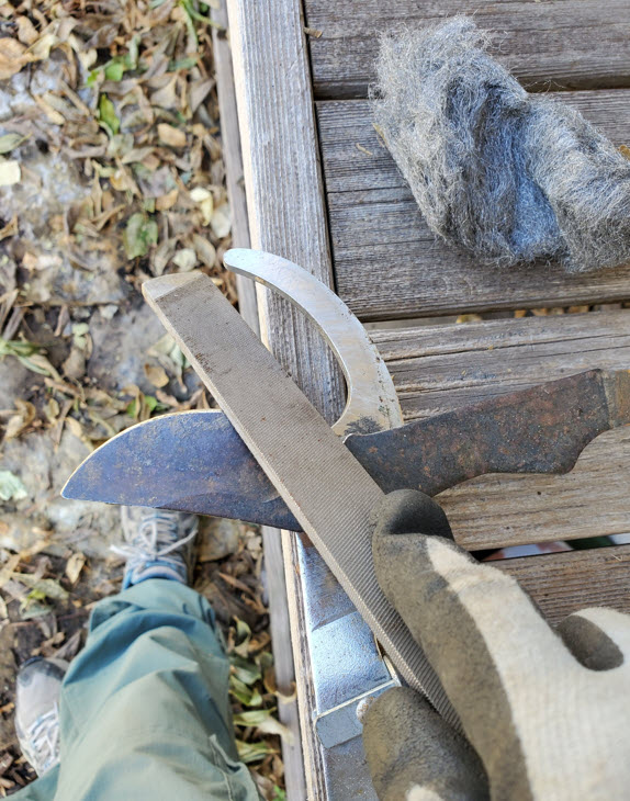 That means sharpening up the pruners and getting to it. Using dry steel wool rub out any rust spots and use a little machine oil on the pivot point. Check the blades for chips, dings or dents. The thick blade on the bottom is called the anvil, the thinner curved blade is the cutting blade. If you see any dents or metal tags on the anvil, it’s time to sharpen it.
